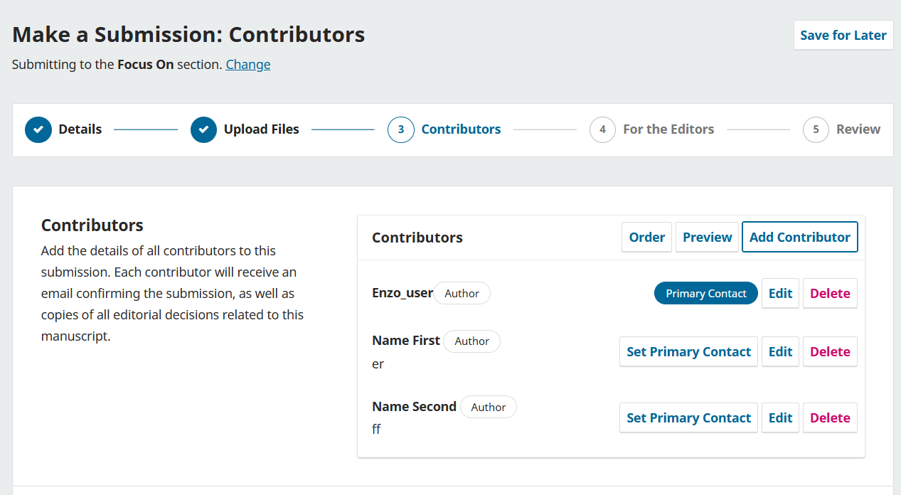During a new submission, if the author add new contributors (specifing name and emails) and click on submit at the final page, he gets a generic error “An unexpected error has occurred”