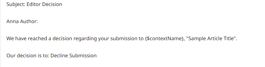 This issue can be replicated by working through an editorial process corresponding to one of the affected templates (e.g. declining a submission pre-review) and viewing the sent email in the activity log: