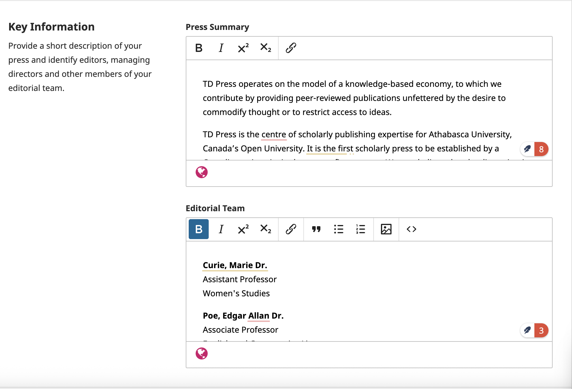 In Settings > Press > Masthead > Editorial Masthead only the ‘Editorial History’ field is showing for editing, and there is no field to include the current editorial team.