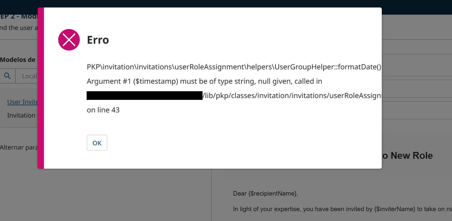 PKP\invitation\invitations\userRoleAssignment\helpers\UserGroupHelper::formatDate(): Argument #1 ($timestamp) must be of type string, null given, called in /lib/pkp/classes/invitation/invitations/userRoleAssignment/helpers/UserGroupHelper.php on line 43