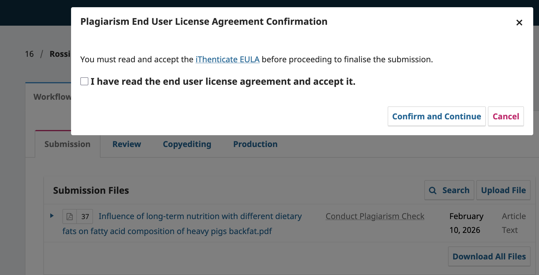 Because autosubmit is turned off, our journal editors do not get the prompt, leaving us without a clear native pathway for them to formally sign or agree to the EULA within the system.