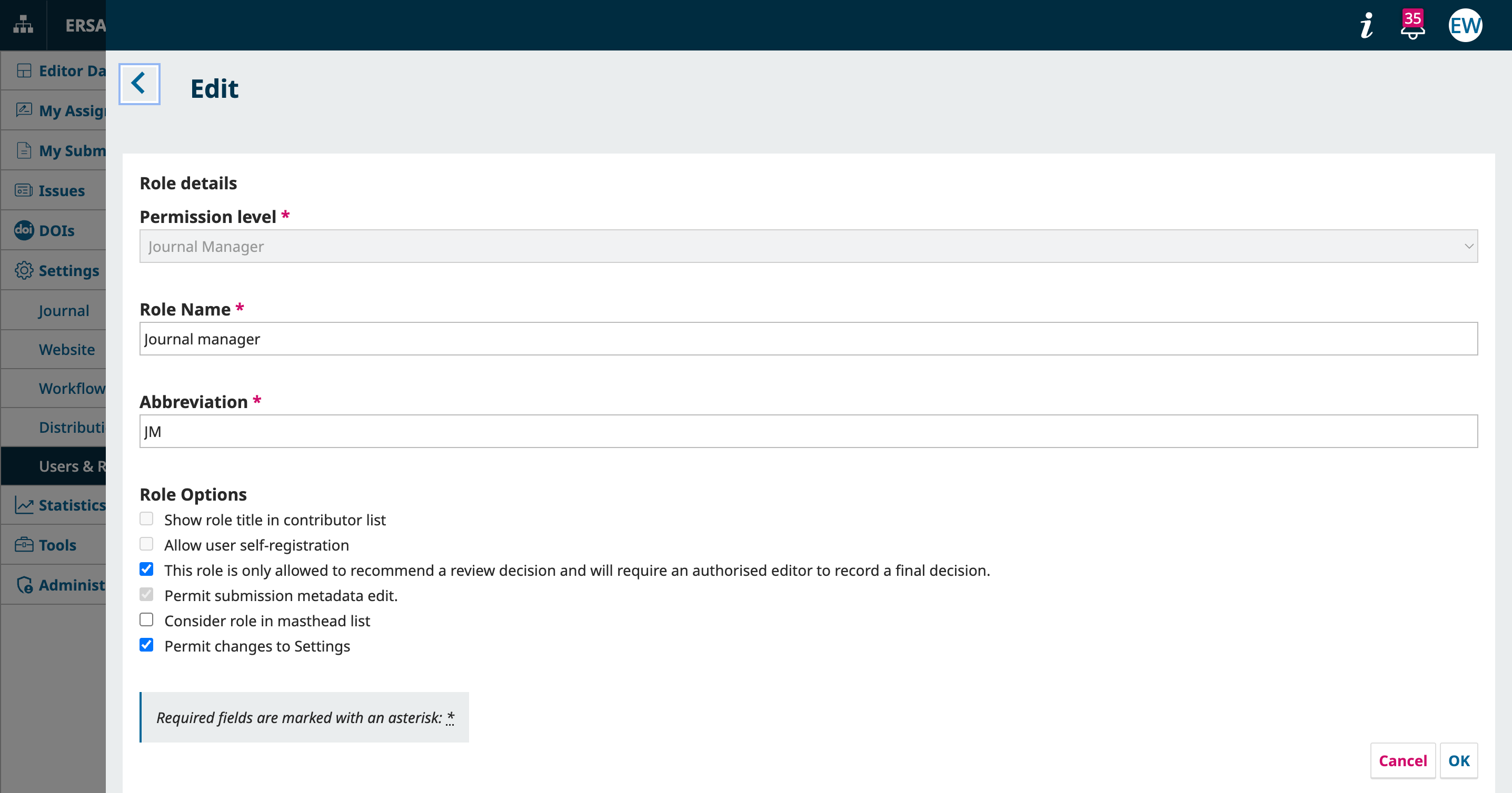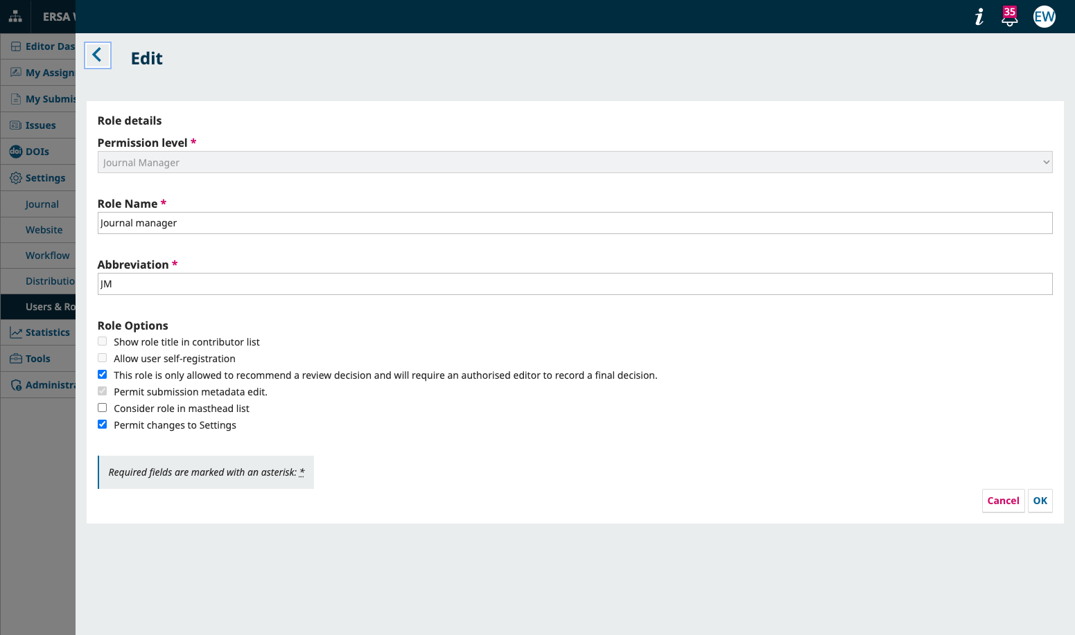 The Journal Manager and Journal Editor role configuration panels