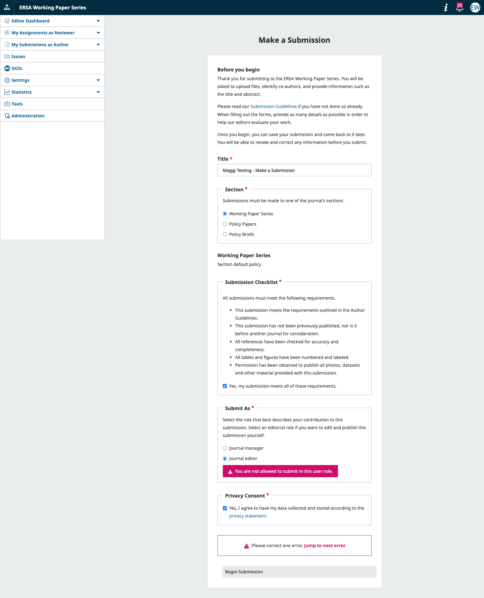 Complete required submission fields (Title, Section, Checklist, Privacy Consent)