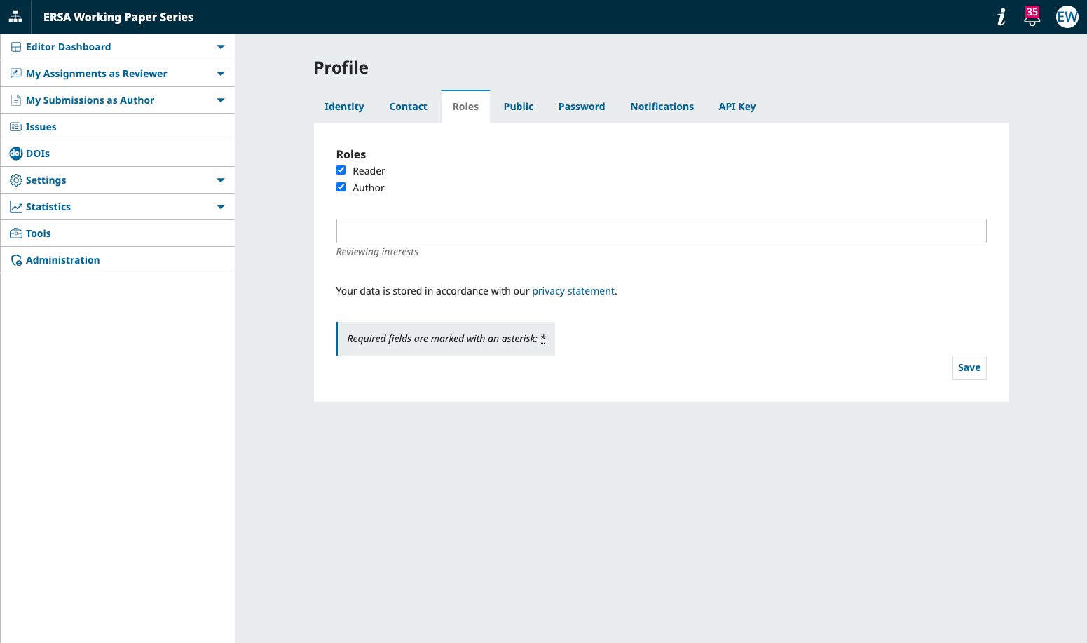 The user has both Author and Reader roles enabled in their profile