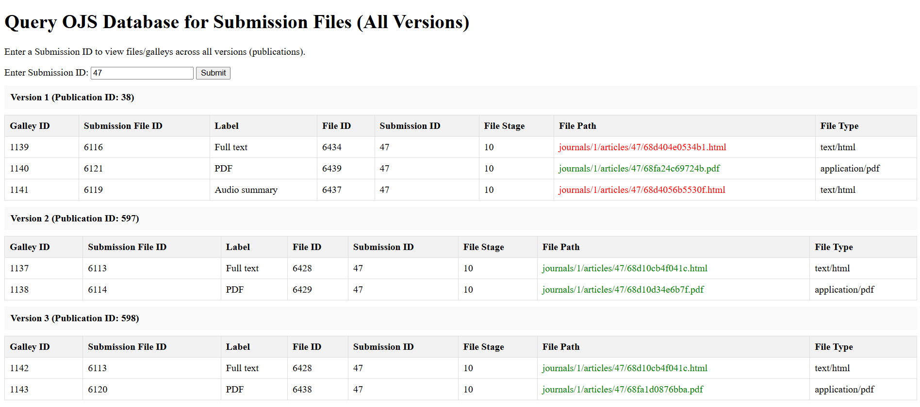 Additionally, I wrote a small utility to query the database, given an article ID it will return all versions and their galley files, shown red where the files do not exist and green where they do. However, in the first version (at the top of the screenshot) the galley files are missing and return 404 errors. The single green galley file in the first version was one I re-uploaded, so it DOES exist on disk, but it still returns a 404!