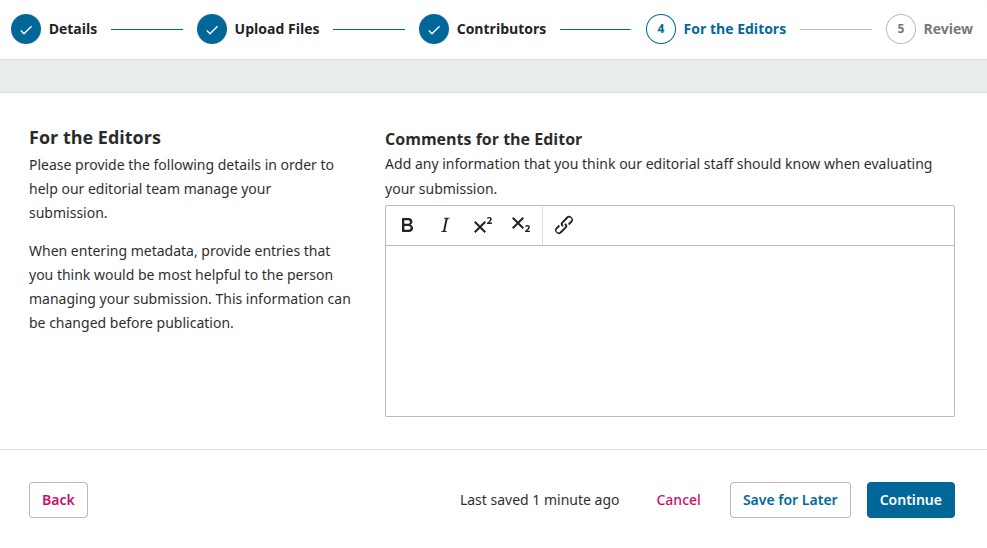 In the For the Editors step, authors can only write comments. I want to add a file upload option here so authors can upload a cover letter during submission.