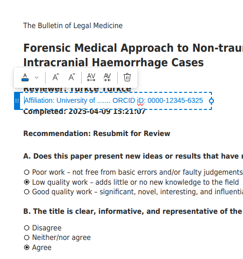 Now, the download function for the peer-review forms is fantastic, and I thank you for it. I would like to add the reviewer’s affiliation and ORCID ID information to the PDF form generated by “Editor Form Shows All Review Sections (PDF)” button, as shown in the image (instead of adding manually). Can you help me determine which file(s) I should modify?