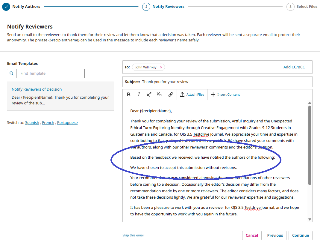 Press continue/skip this email buttons to proceed to ‘Notify Reviewers’ stage