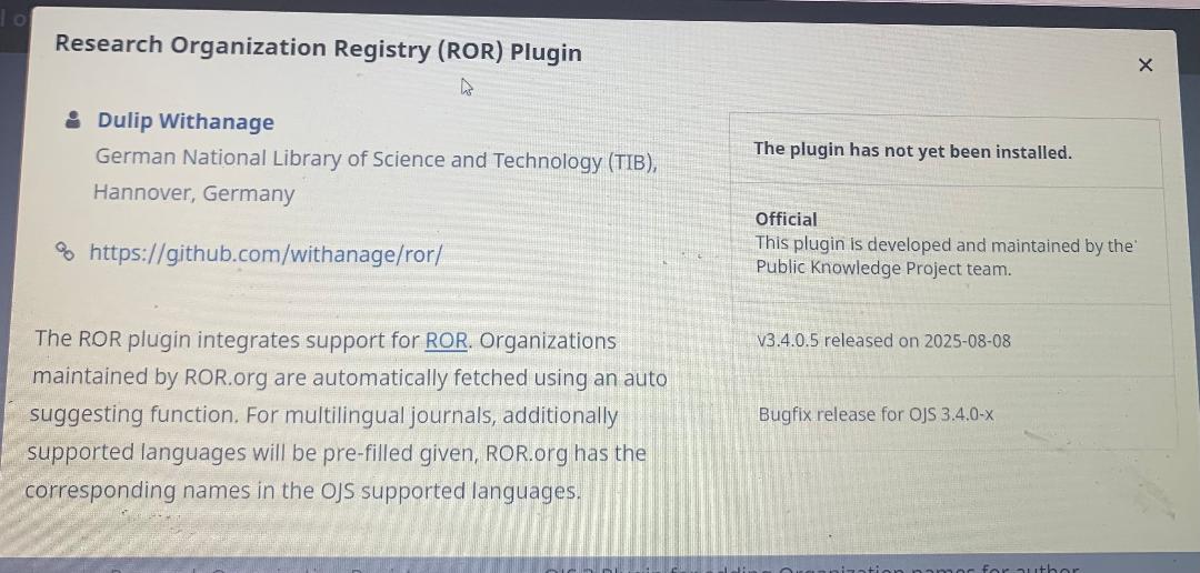 I am using OJS 3.4.0.8. I tried to activate the ROR plugin. I have seen that it is uninstalled. I tried https://github.com/withanage/ror/. However, the ROR plugin does not show up. I am attaching below. Can you help me to install ROR?