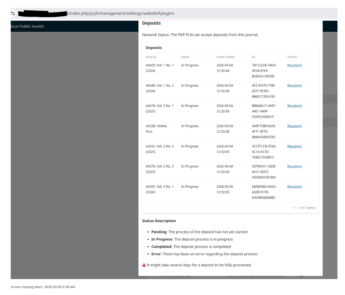 Today March 6th screenshot on the same plugin and journal and archived items statuses have been updated, we will leave this ticket open for 2 or 3 weeks for monitoring purpose (above lockss_state = inProgress) … then close upon successful resolution.