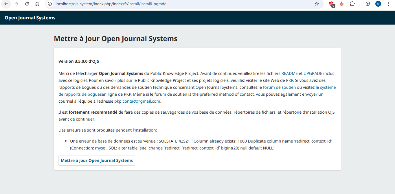 During the upgrade process of OJS from version 3.4 to version 3.5.1 in my local environment (localhost), I encountered a database error that prevents the installation from completing successfully. As a result, the upgrade fails with the following error message: “SQLSTATE[42S22]: Column not found: 1054 Unknown column ‘redirect’ in ‘site’ (Connection: mysql, SQL: alter table site modify redirect bigint null)”. Could you please advise me on how to resolve this issue so that the upgrade can be completed without errors? You will find a screenshot of the returned error attached for reference.