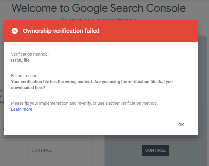 I tried there but got a notification that is “Ownership Verification Failed“. Basically what is the solution behind it. Please give me a suggestion if any.