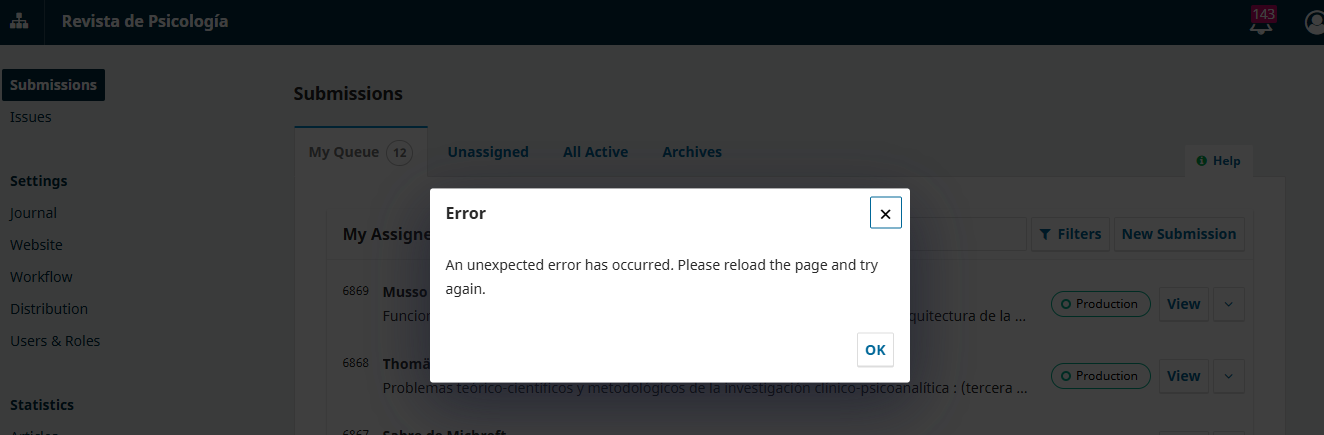 Hello, when I open the subsmissions panel I get an unexpected error. In addition all archived, active and unasigned submissions dissapeared. Also, plugins in the installed gallery are not displayed.